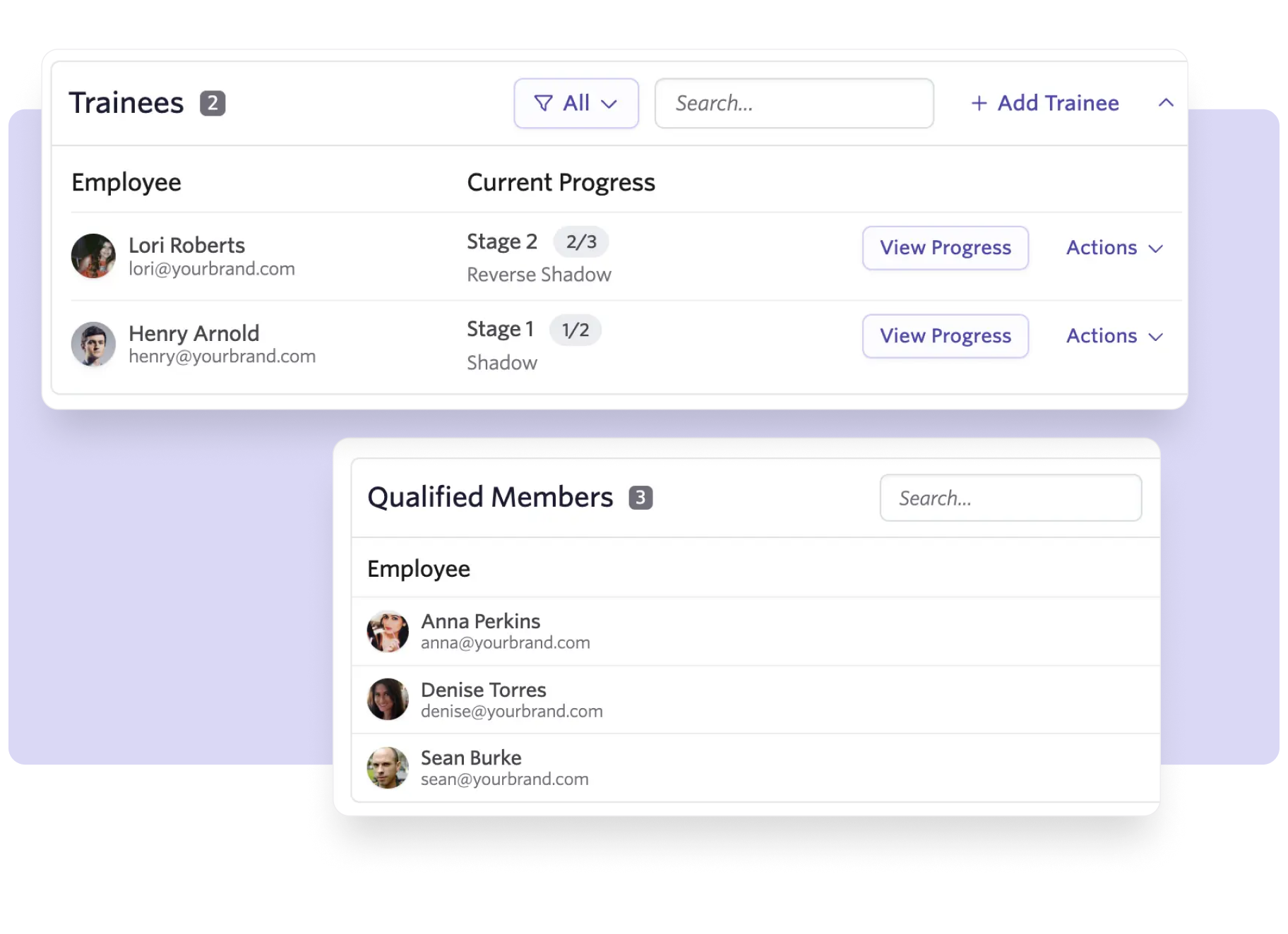 Track qualified and trainee interviewers through structured stages, including shadows and reverse shadows, to build skills-based interviewer pools.