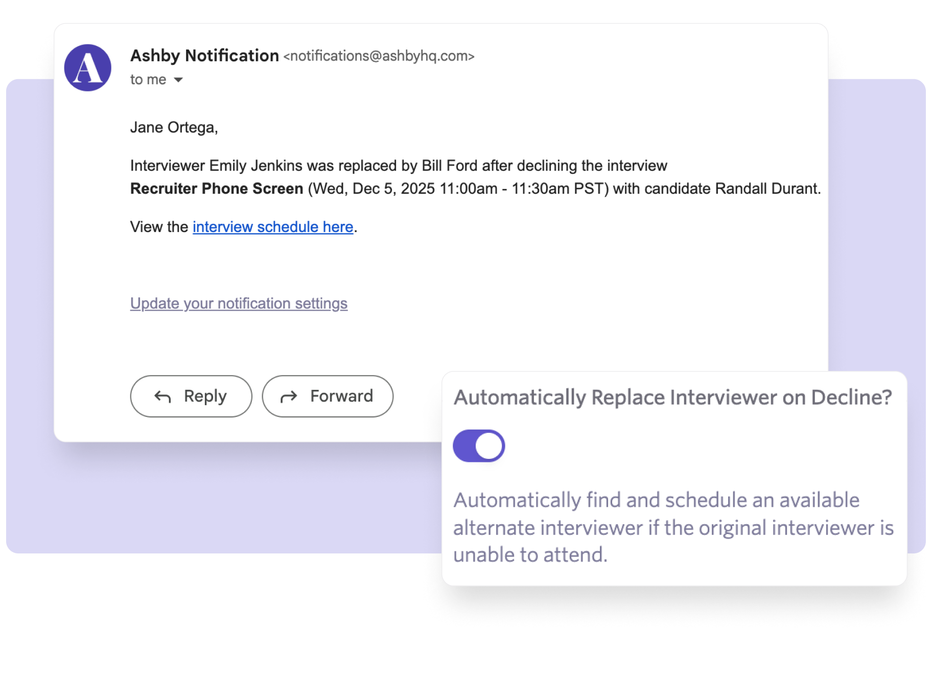 Ashby automates replacements, swapping declined interviewers with alternates and notifies organizers when things change.
