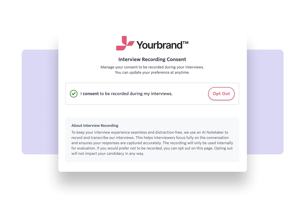 All permissions and consent are handled natively in one place, with transparent candidate flows, granular access controls, and data retention configuration.