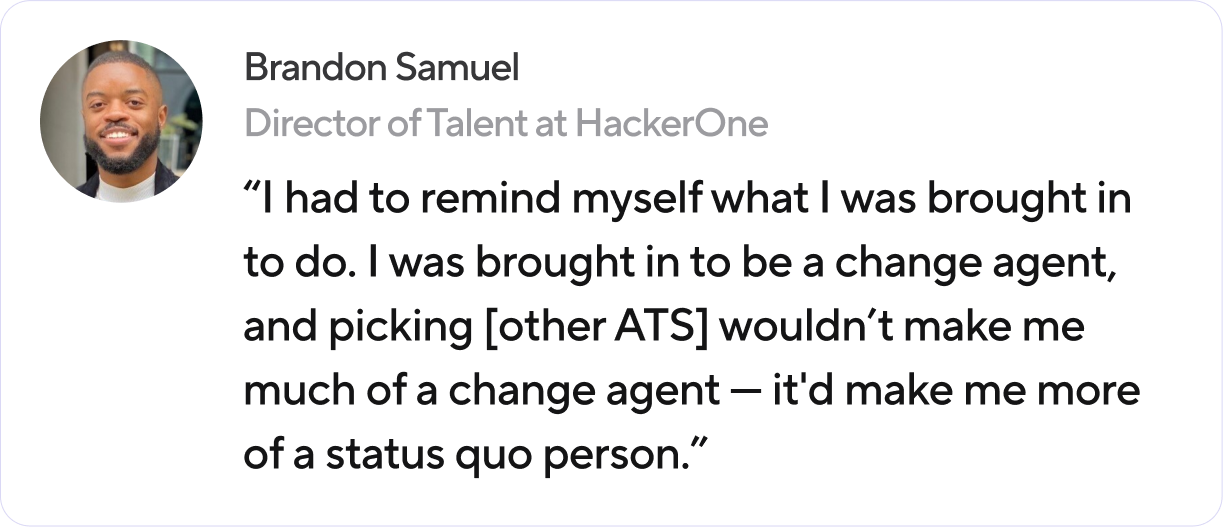 When HackerOne began planning for scale, they took advantage of slower hiring periods as the perfect time to introduce new tools and give their team time to embrace the changes. To lead this new chapter, they brought on a new Director of Talent, Brandon Samuel. His first assignment? Select a new ATS before the legacy system’s contract expires.