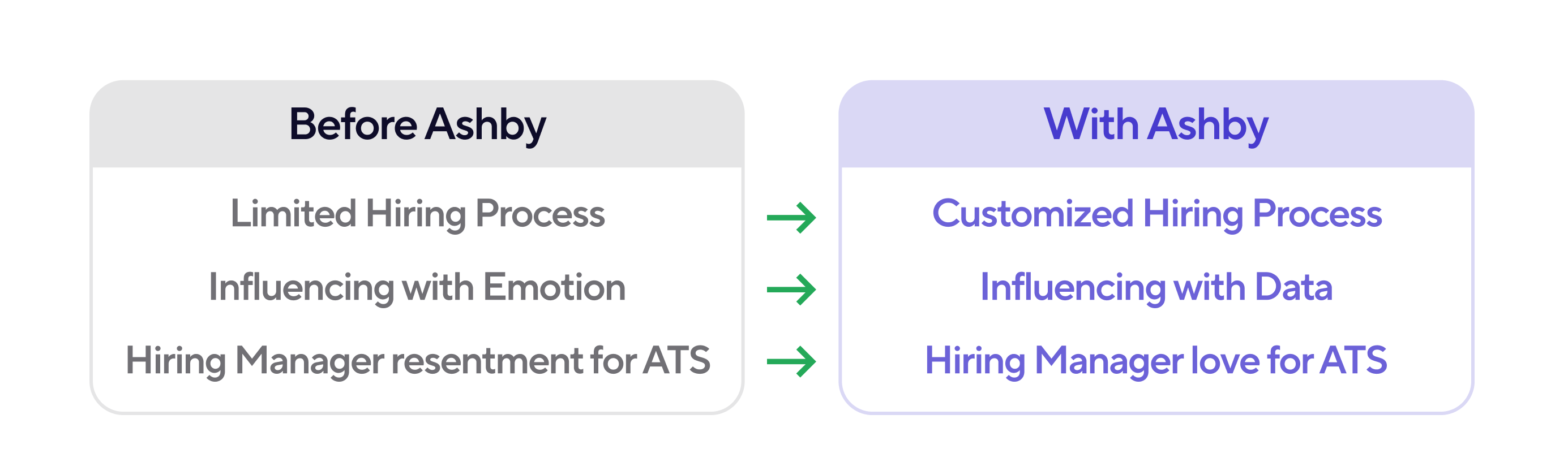“Arjun [Ashby Product Manager] made me feel, okay I can do this. His support and accessibility made me feel comfortable in a way that I wouldn’t have otherwise. Even just on the Workday integration; despite never using the tool, Marizza looked into it fully on her own and had a list of questions — and Arjun always had an answer. It was so impressive on both ends, they both had a level of investment in making sure implementation went smoothly.”