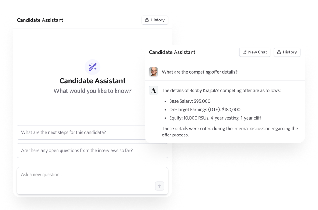 Access full candidate context through a chat assistant. Ask questions, get up to speed quickly, draft communications, and more.