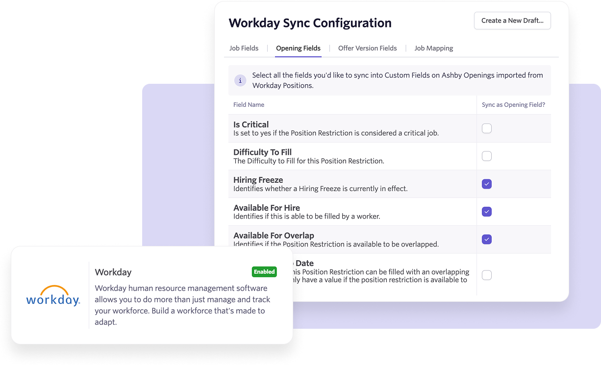 Automatically import all Workday® metadata, including custom and calculated fields, with zero maintenance. Configure what syncs and report on Workday® data directly in Ashby.